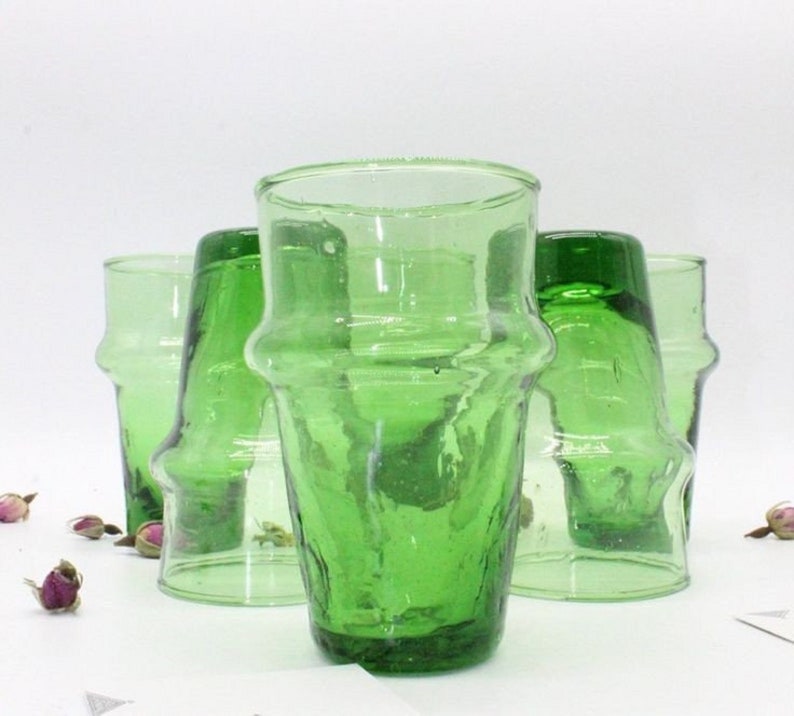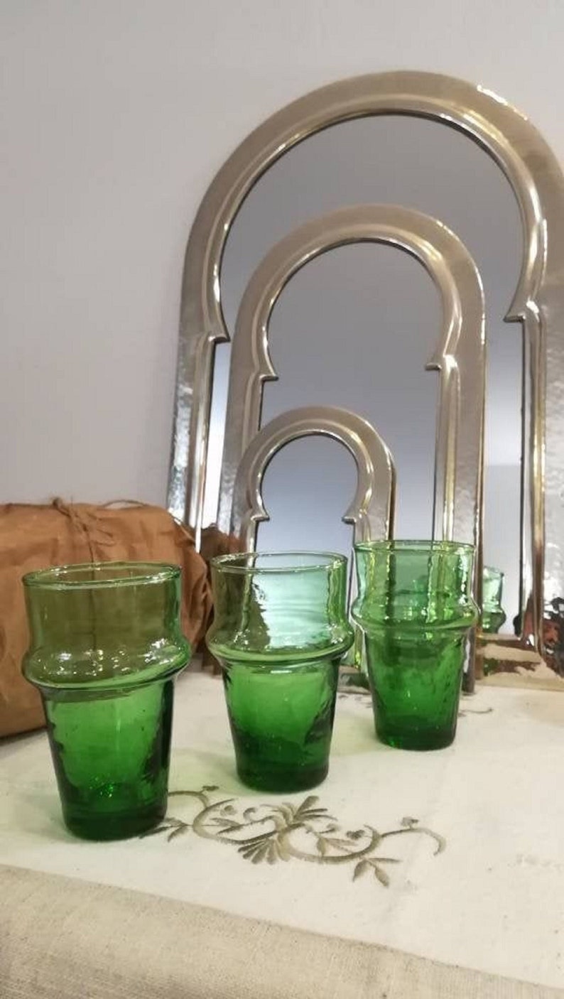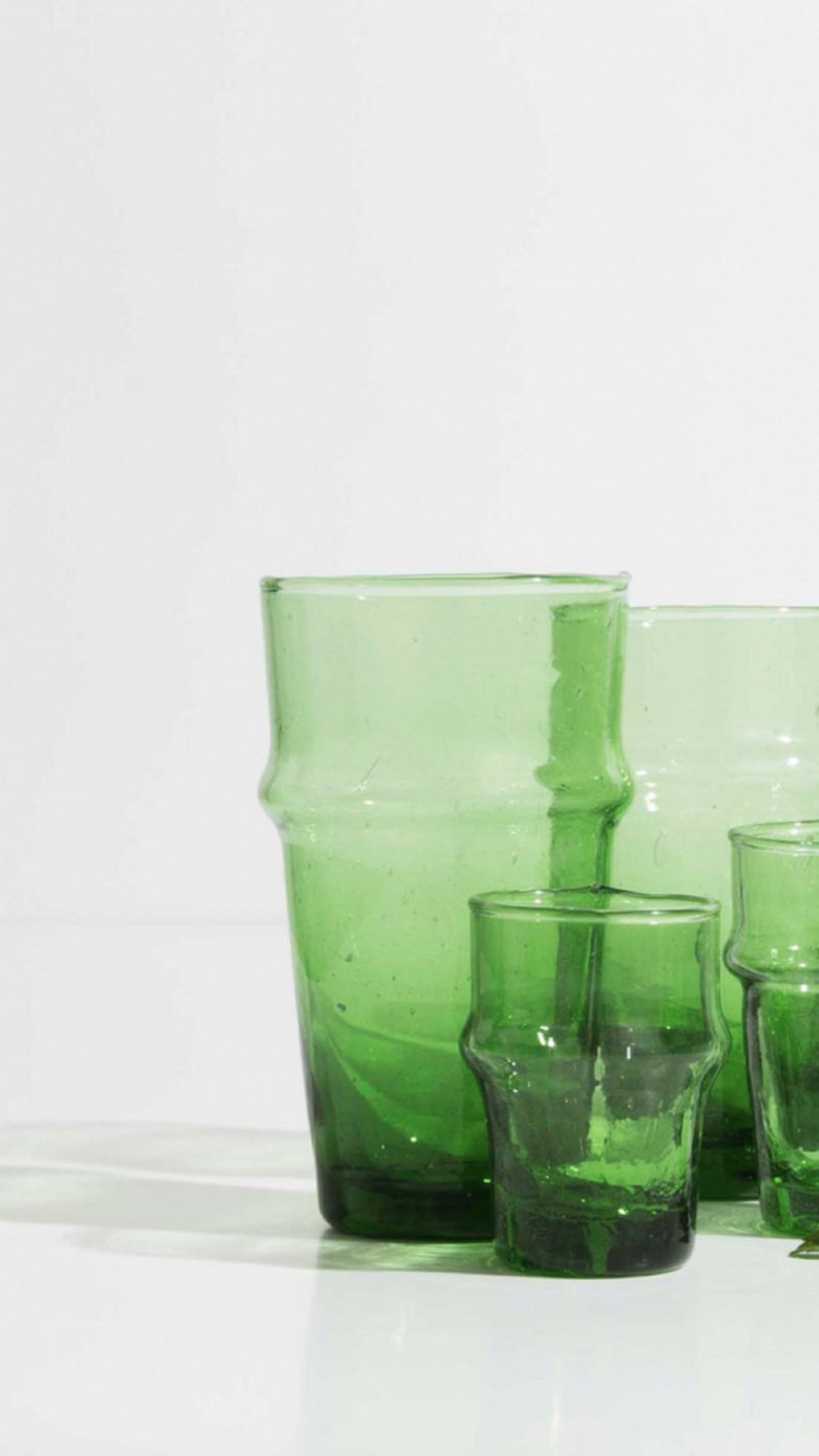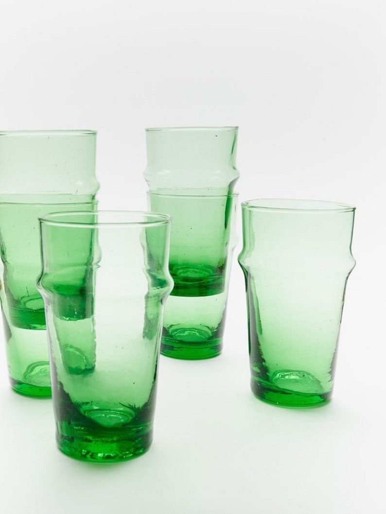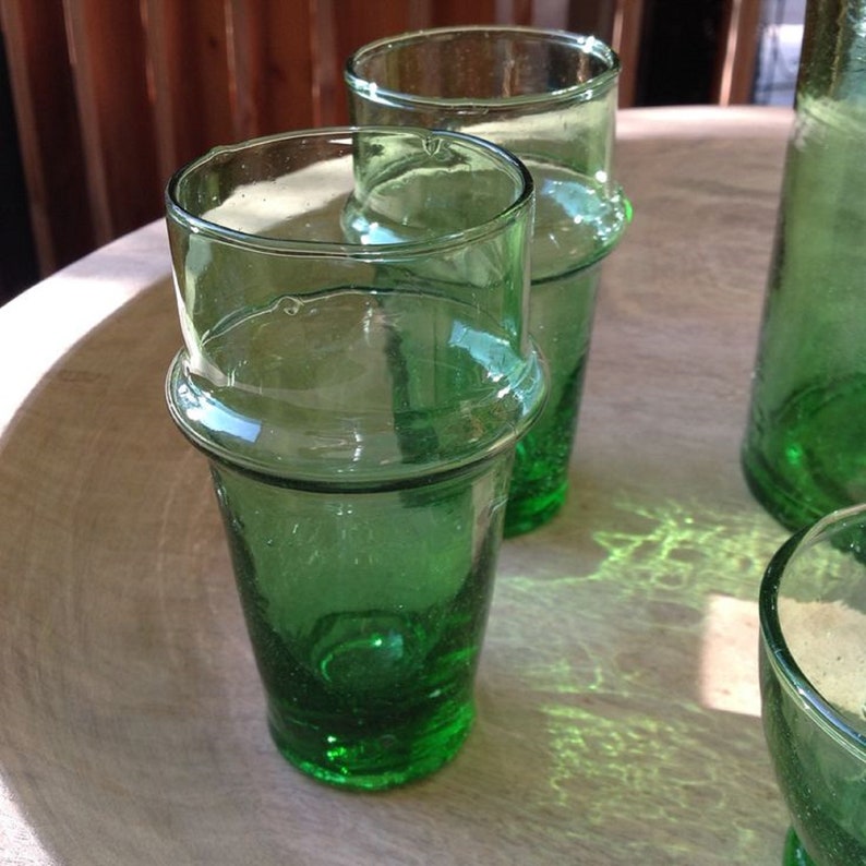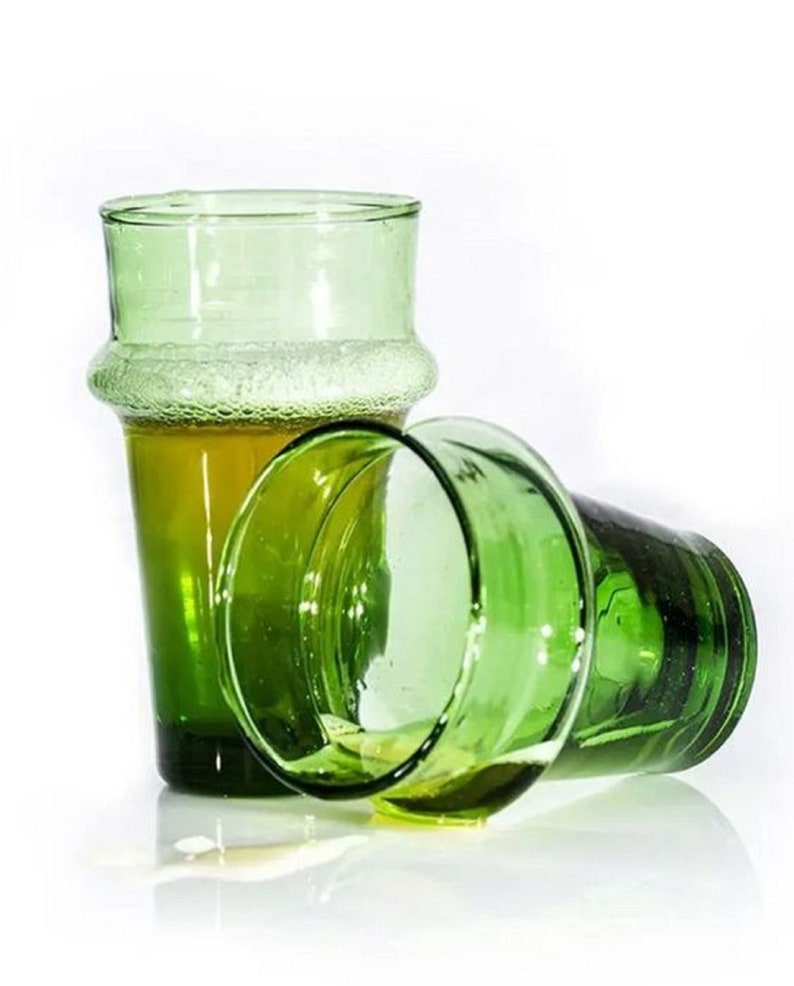 These Moroccan Green Beldi Glasses are handblown by skilled artisans using recycled glass, making each piece slightly unique in shape, thickness and character. Their warm amber tone catches the light beautifully and adds a natural, earthy elegance to your table. Perfect for tea, coffee, juice, cocktails or water, these glasses bring a touch of Moroccan craftsmanship to everyday living. Durable, timeless and eco-friendly, they pair easily with modern, boho or minimalist home decor.