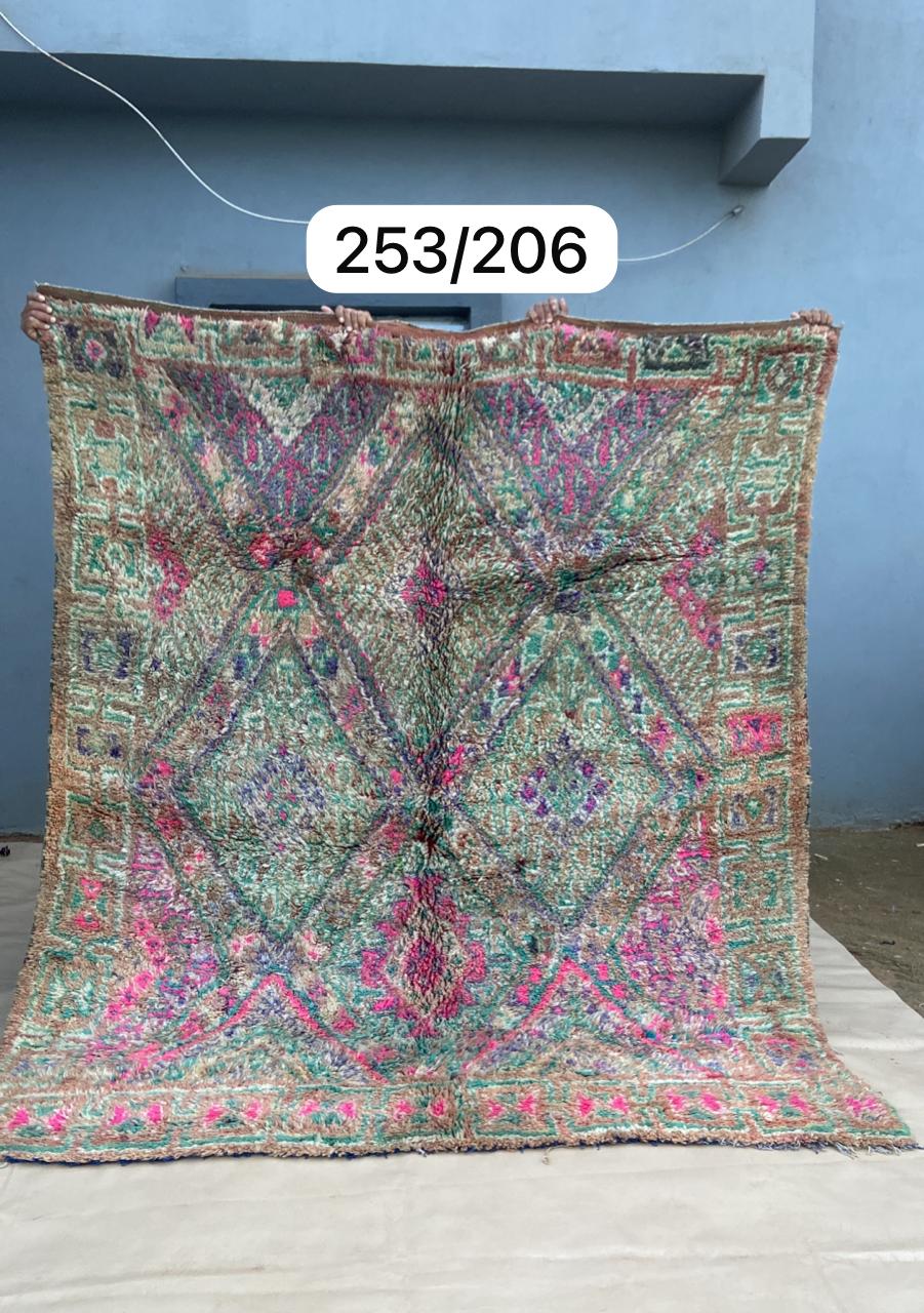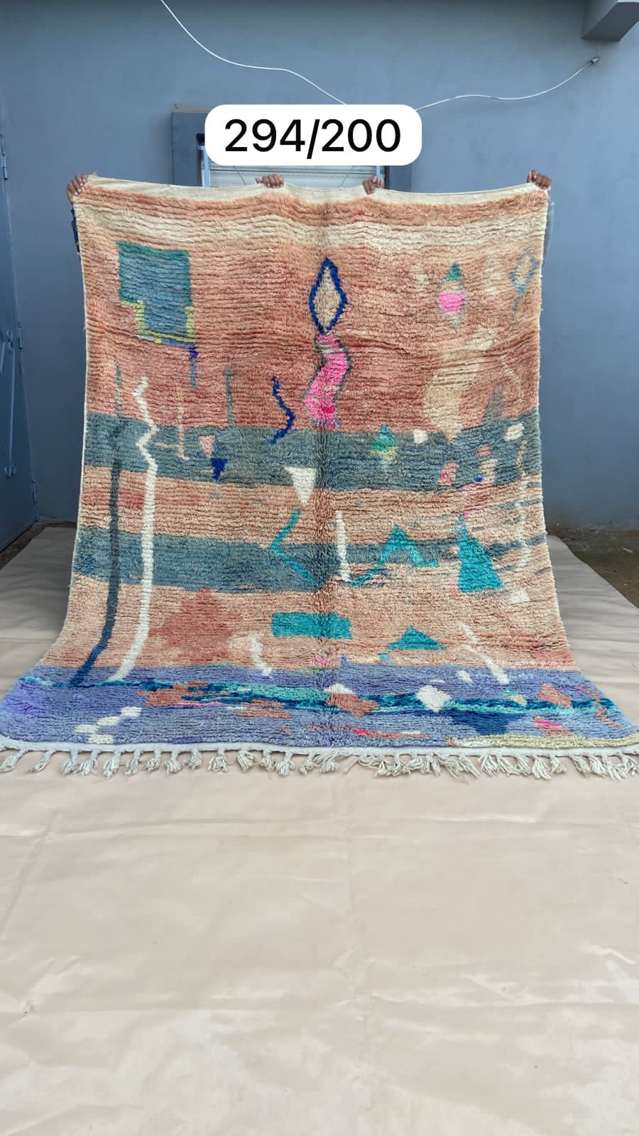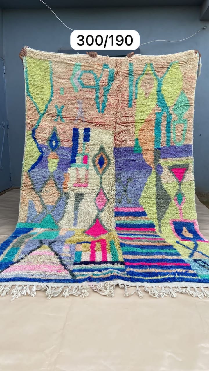This Moroccan handmade Berber rug is crafted from 100% natural wool by skilled artisans in the Atlas Mountains. Featuring a vibrant turquoise base with colorful geometric motifs, each symbol tells a story rooted in Amazigh tradition. Soft, thick, and durable, this one-of-a-kind rug adds warmth, texture, and authentic Moroccan character to living rooms, bedrooms, or boho interiors. Perfect for modern, bohemian, or eclectic home décor.