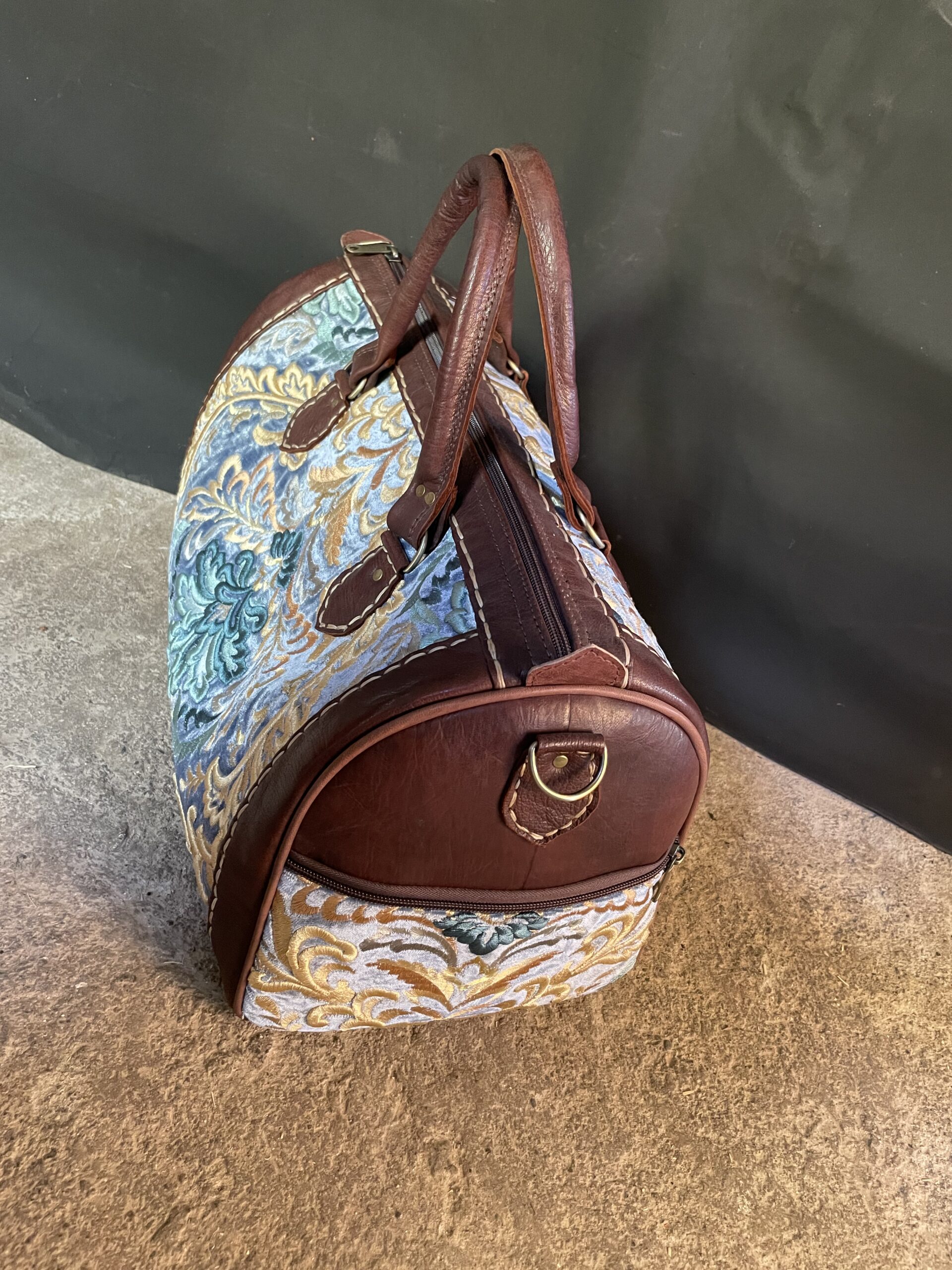 This unique weekender duffle bag combines authentic Moroccan embroidery with high-quality genuine leather, making it the perfect balance of elegance and durability.