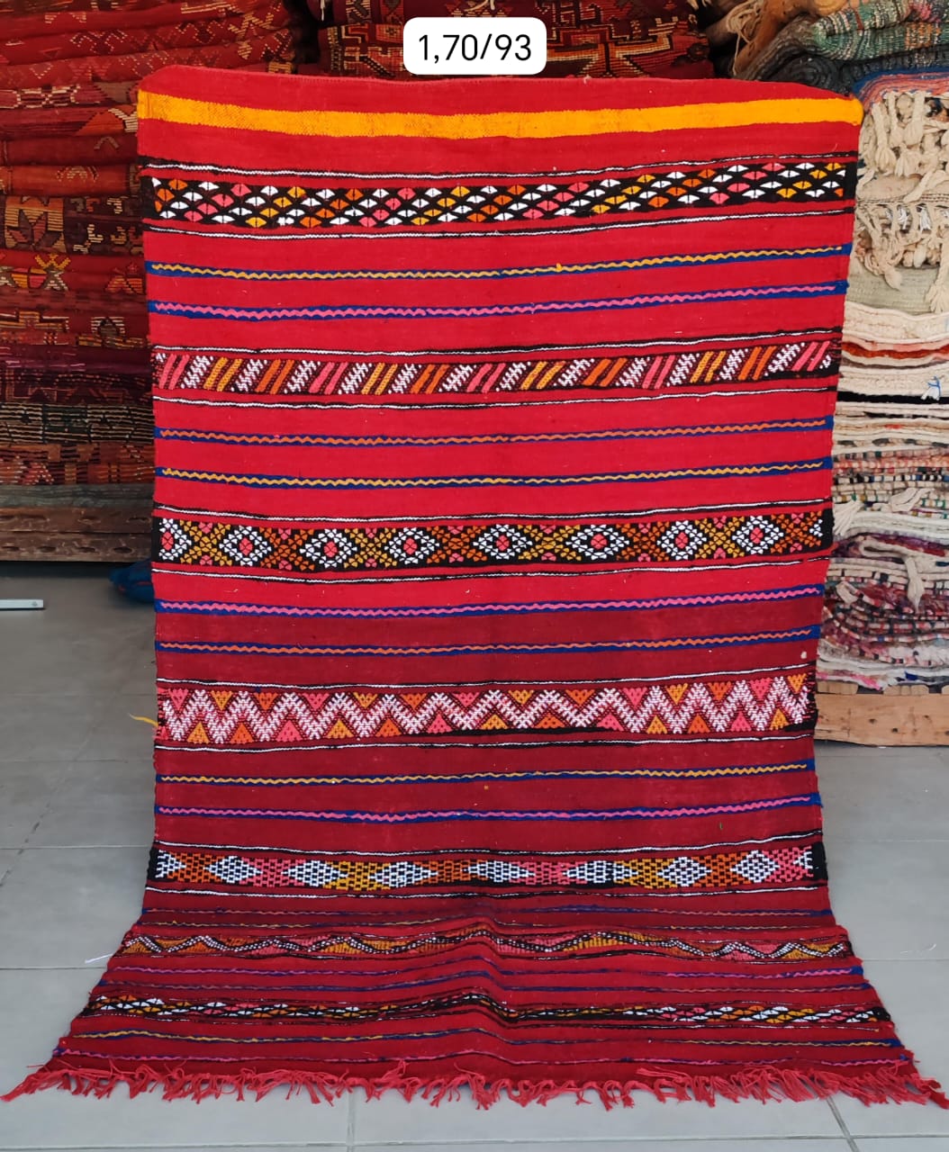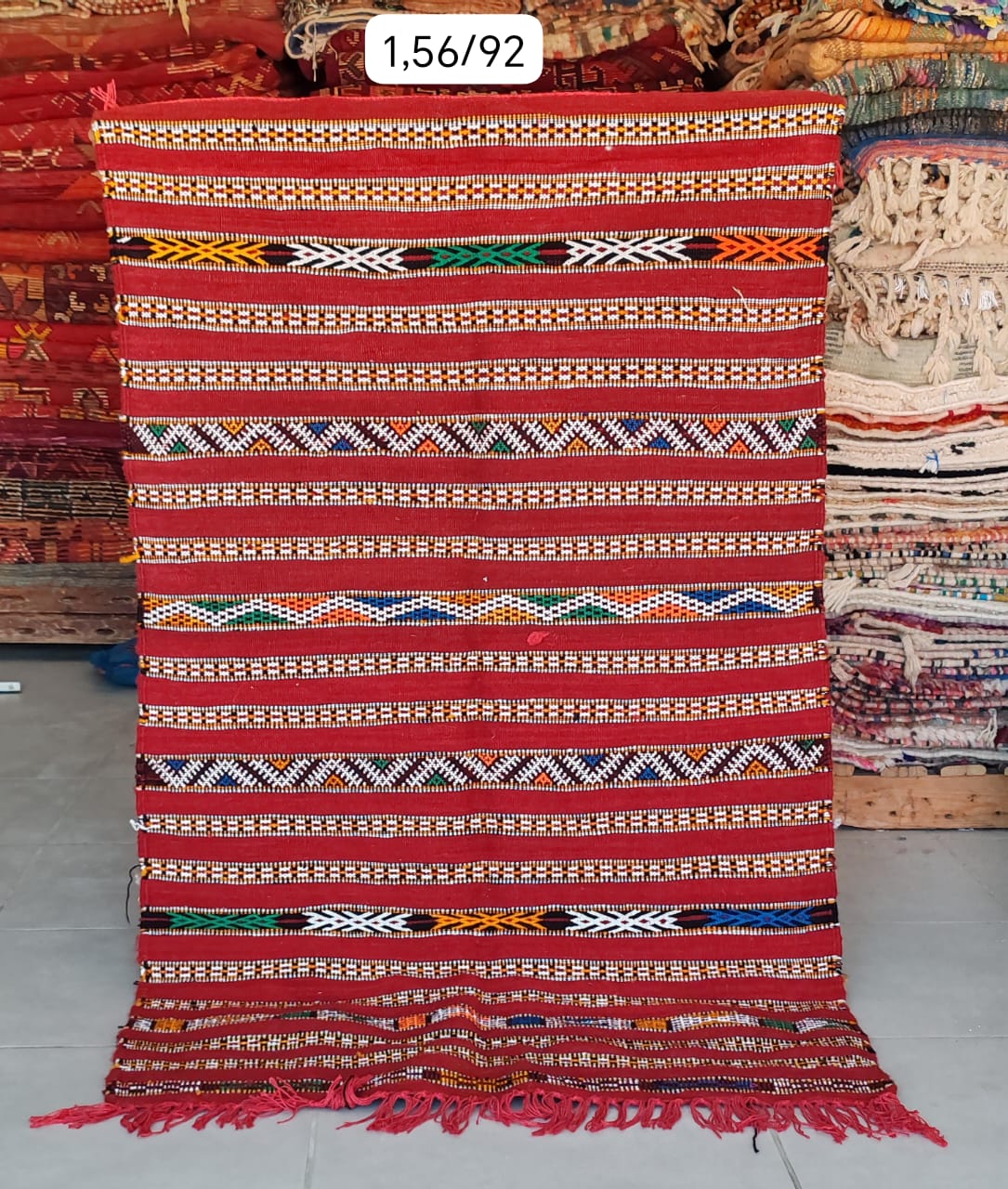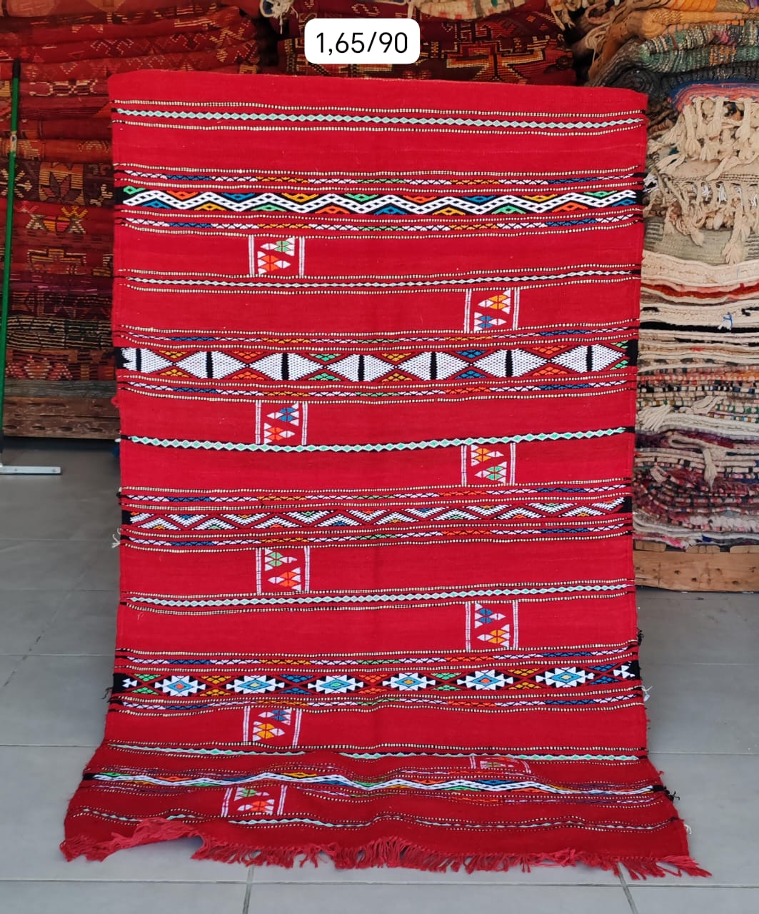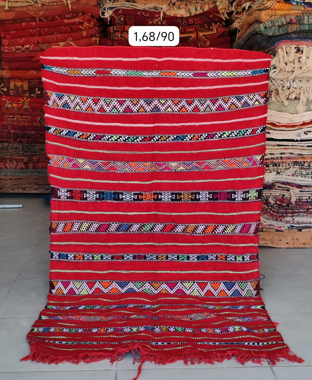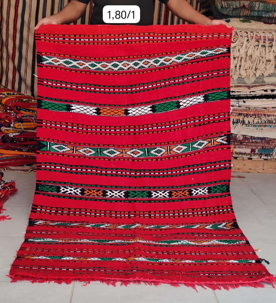 This handwoven Hanbel rug is crafted by skilled artisans using traditional weaving techniques from the Atlas region of Morocco. Lightweight, soft, and beautifully patterned, it features vibrant colors and symbolic Amazigh (Berber) motifs. Its elegant red tones make it perfect as a floor rug, wall tapestry, sofa throw, or bed cover.