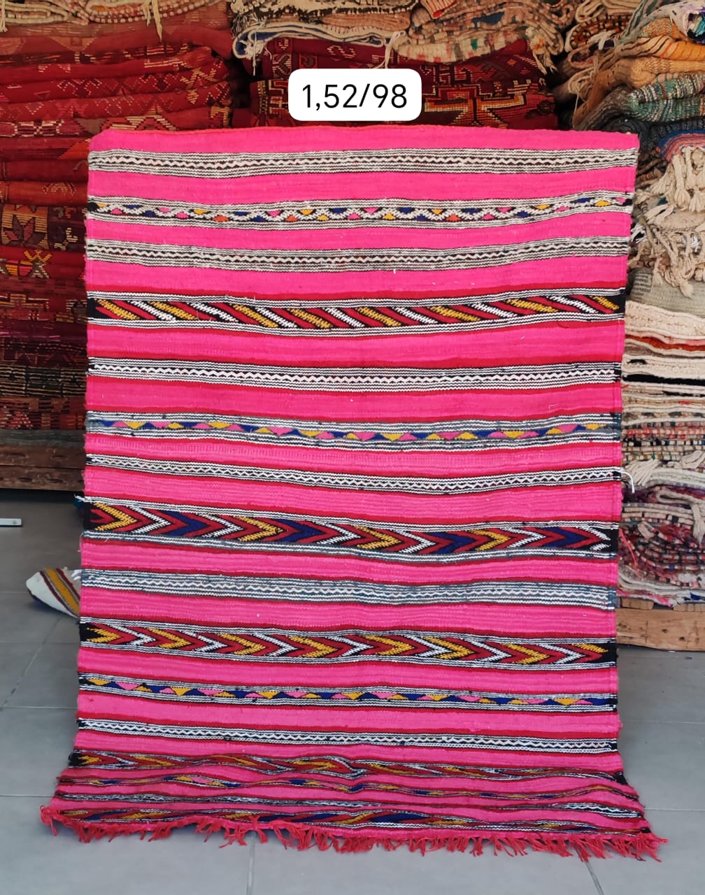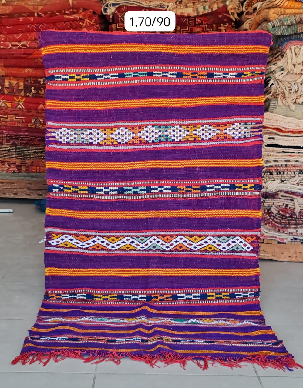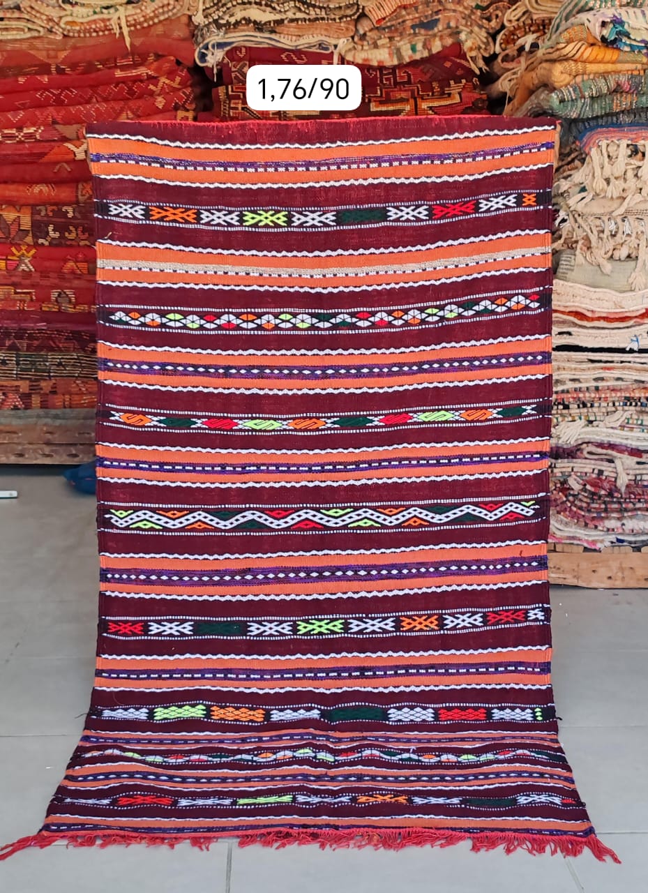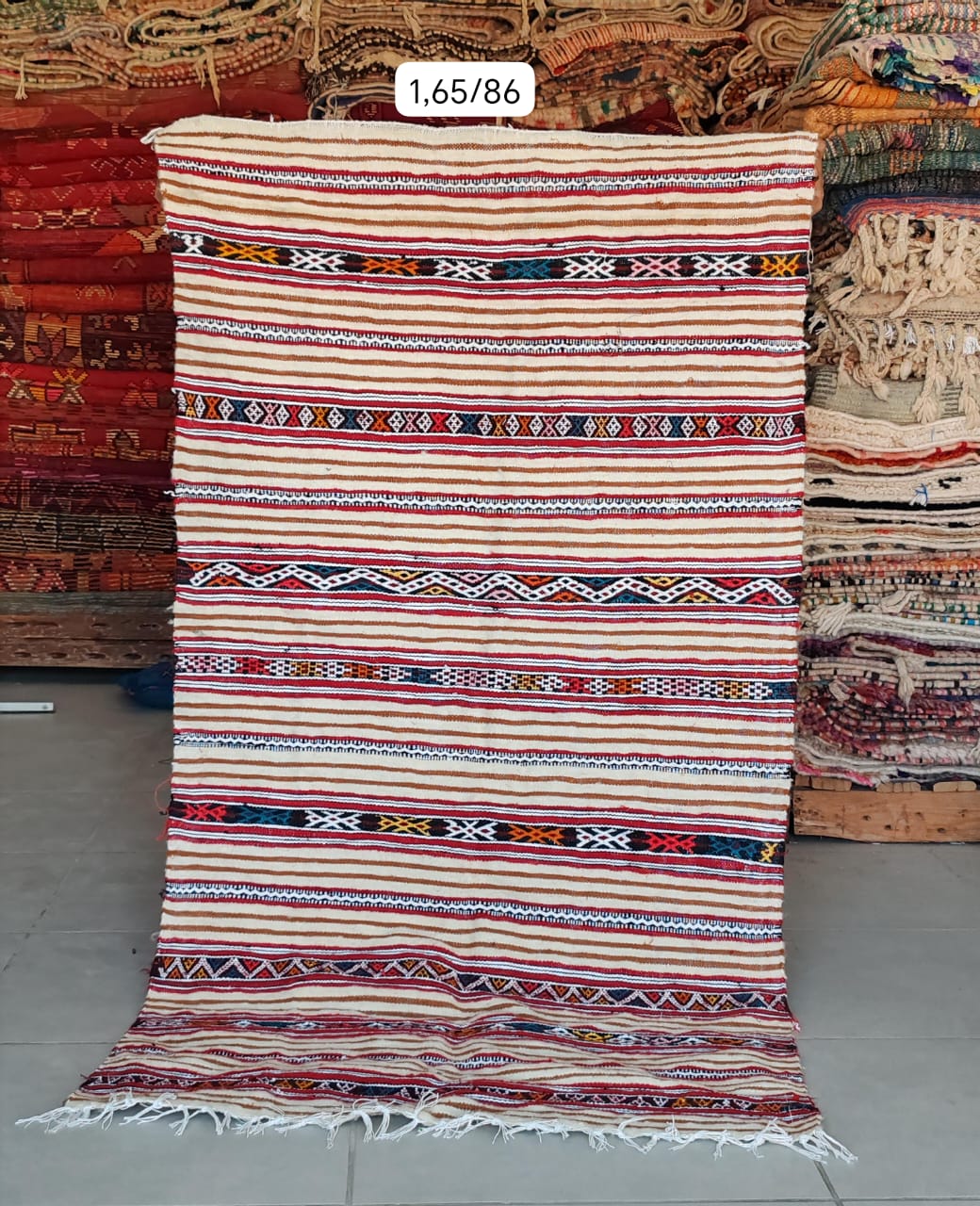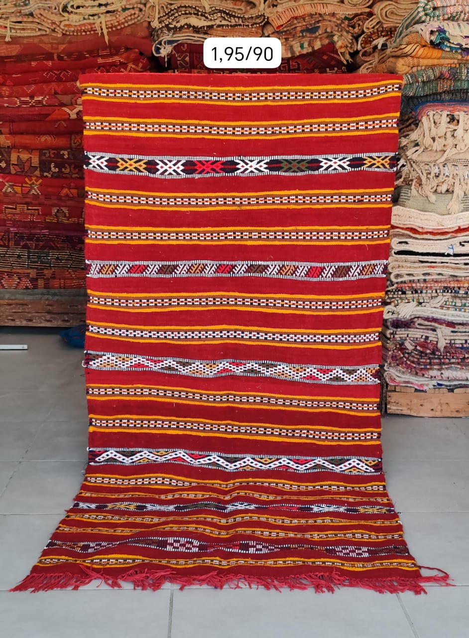 This handwoven Hanbel rug is crafted by skilled artisans using traditional weaving techniques from the Atlas region of Morocco. Lightweight, soft, and beautifully patterned, it features vibrant colors and symbolic Amazigh (Berber) motifs. Its elegant red tones make it perfect as a floor rug, wall tapestry, sofa throw, or bed cover.